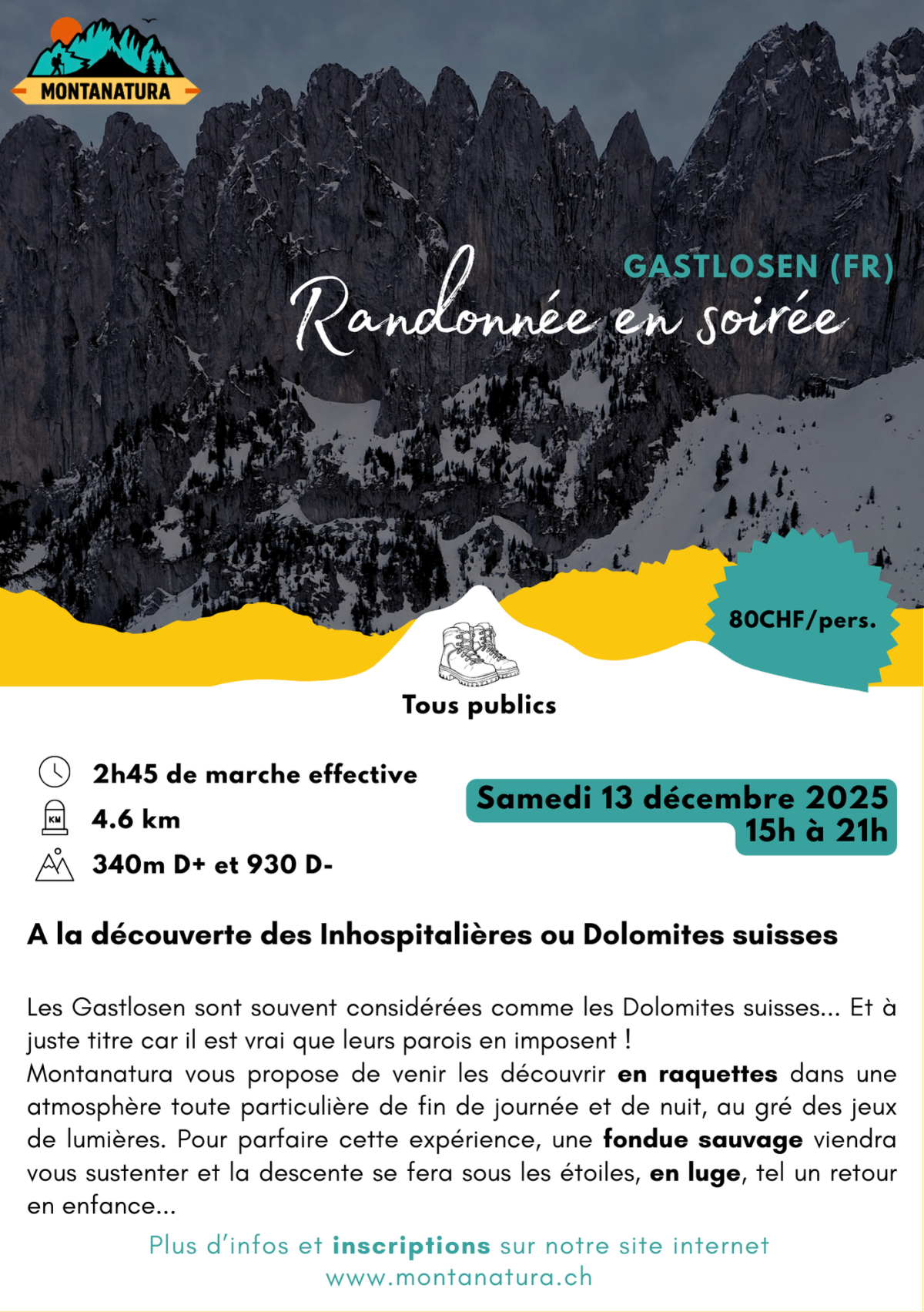 80CHF / personne (fondue sauvage incluse)